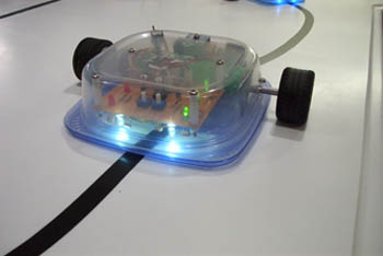 Sandwich is the line-following robot detailed in David Cook's book, Robot Building for Beginners. The book and robot are great for the beginner classes since it goes into detail about each component that make up Sandwich. Each member in the beginner class builds their our individual Sandwich for the hands-on experience of working with electronics breadboards and shop tools. The electronics can be adopted to a larger frame made of 80/20 aluminum extrusions as seen below. One student built a six-wheeled vehicle using the same electronics circuit.