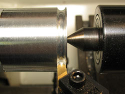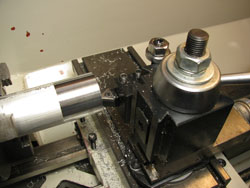 Step 7: Set-up toolpost with parting tool to cut shaft notch. Cut notch in 3 steps. Leave a little extra width of the flat outer surface to the left of the groove when cutting the notch.
